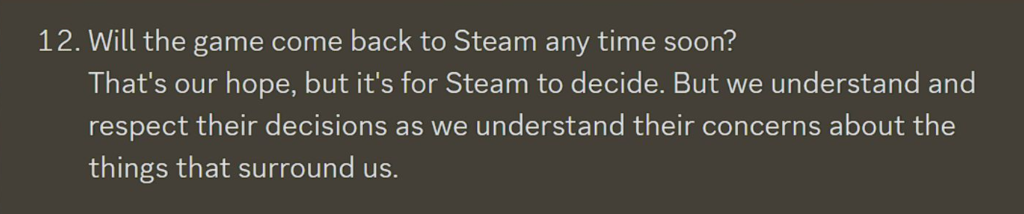 「我々もSteamでの配信再開を望んでいますが、Steam次第です。しかし、我々はValveの判断を理解し、尊重しており、彼らが我々を取り巻く状況を懸念しているのも理解しています。」