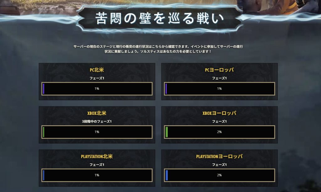 このイベントでは、各メガサーバーのプレイヤー達が協力し、クエストを完了するなどして進行度を高めることで、次のフェーズに進むことができる。