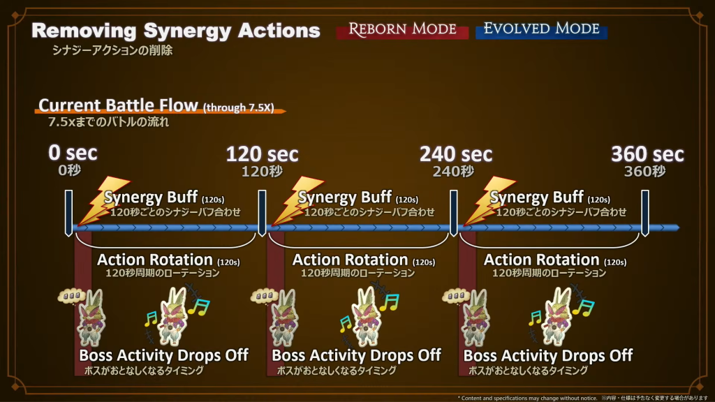 2分ごとに他のパーティメンバーとシナジーアクションを合わせて、いわゆる「バースト」を行うことが最重要となるため、他の戦闘法は全く推奨されず、開発チームも2分のローテーションに合わせてジョブアクションを設計、結果的にジョブの個性が失われるという問題が発生していると説明した。