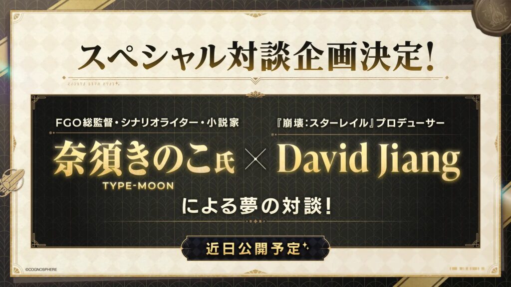 大型アップデートや1周年を記念しての各種イベントも実施予定となっており、TYPE-MOONの奈須きのこ氏と、崩壊:スターレイルのプロデューサーDavid Jiang氏との対談も決定している。