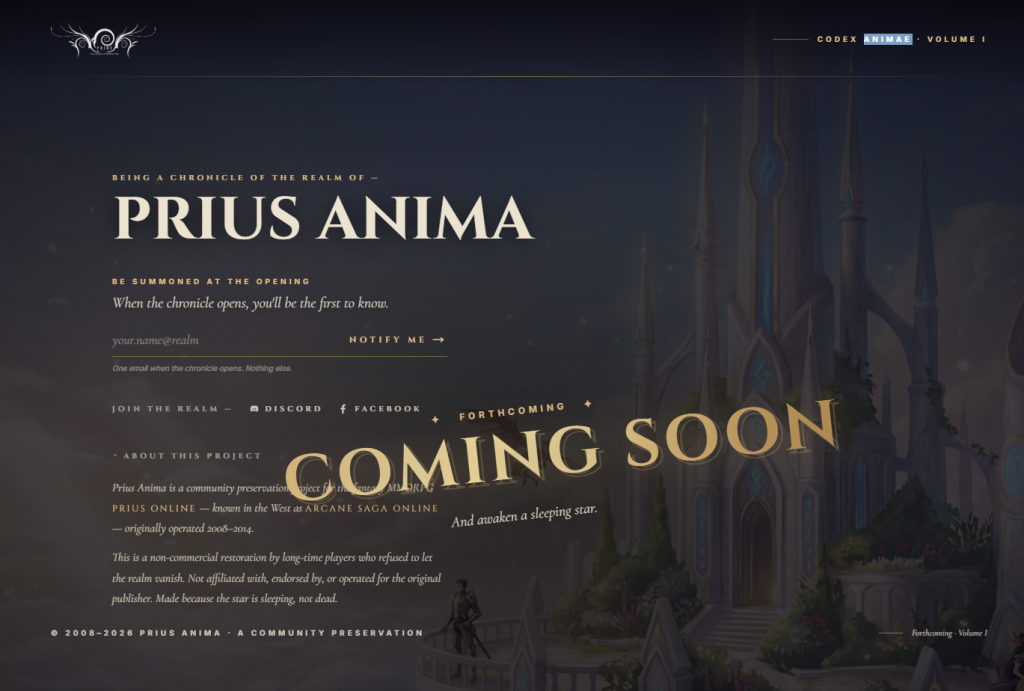 Prius Animaは、ファンタジーMMORPG「Prius Online」(欧米では「Arcane Saga Online」として知られる)のコミュニティ保存プロジェクトです。Prius Onlineは2008年から2014年まで運営されていました。