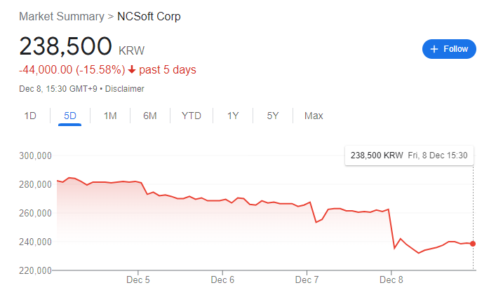 MMORPG「Throne and Liberty (スローン・アンド・リバティ)」が12月7日に韓国サービスを開始したが、開始翌日に開発・運営NCSOFTの株価が暴落した。