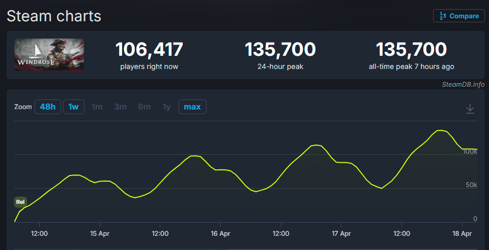 4月14日にアーリーアクセス版が発売されたオープンワールドサバイバルクラフトゲーム「Windrose(ウィンドローズ)」が、4月17日にSteamの同時接続者数13万5700人を記録し好調だ。